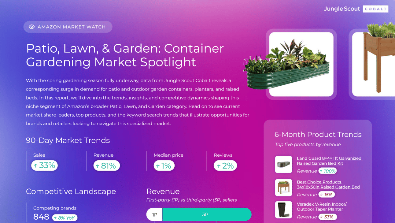 Jungle Scout выложил детальный отчет по нише Patio, Lawn & Garden, рынок США. Если “Сад и Огород” — это ваша категория бизнеса, то будет интересно почитать (не забудьте листать, стрелка справа). А еще есть возможность забукать демо — пишут, что такой отчет можно сформировать по любой категории.